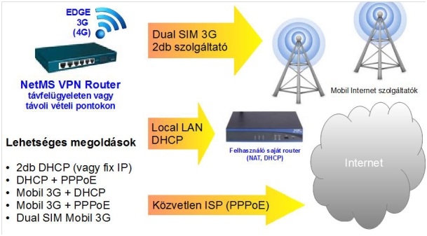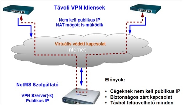 Internet alapú kommunikáció történik az átjátszókkal. A NetMS rendszer ötvözi a rádióhálók olcsó üzemeltetését a modern IP (Internet Protocol) alapú kommunikációval. A NetMS rendszer hátterében az Interneten lévő routerek és szerverek hálózata van. Képesek vagyunk átjátszókat bekötni szinte bármely Internet hozzáféréssel. Vezetékes (WAN, LAN), Mobil 3G, Mikró (WLAN). Az átjátszókba épített routerek biztonságos VPN kapcsolatokon keresztül csatlakoznak a távfelügyeletnél üzemelő NetMS szerverhez.