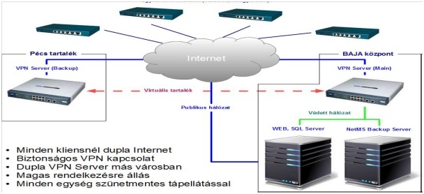 Minden kapcsolat zárt magánhálózatban történik (VPN). Az általunk üzemeltetett VPN szerverekből is kettő van, meghibásodás vagy karbantartás esetén, a tartalék rendszeren zavartalanul folyik tovább a kommunikáció. A VPN szerverek földrajzilag is külön helyen vannak, ezért ha pld. villám miatt, kiesne az egyik, a tartalék tovább él.